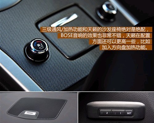 ??? 车内的差别主要是一些设置,,,,,好比顶配车型的座椅不但拥有钥匙影象功效,,,,,座椅的透风和加热也都是三挡可调的。。。。。。。。另外顶配车型还配备了9扬声器的BOSE 2.0音响系统,,,,,外后视镜在挂入倒挡时也会自动翻折向下。。。。。。。。