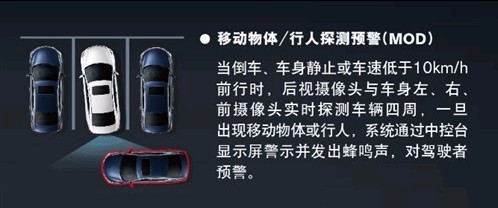 ??? MOD移动物体/行人探测预警功效可以感应到将要横穿车尾的物体或行人,,,,,阻止因视线受阻或驾驶员疏忽而爆发的倒车撞人事故。。。。。。。。当有行人要穿过车尾时,,,,,液晶屏上的倒车影像会泛起一圈黄色的描边,,,,,同时还会伴有声音的报警。。。。。。。。
