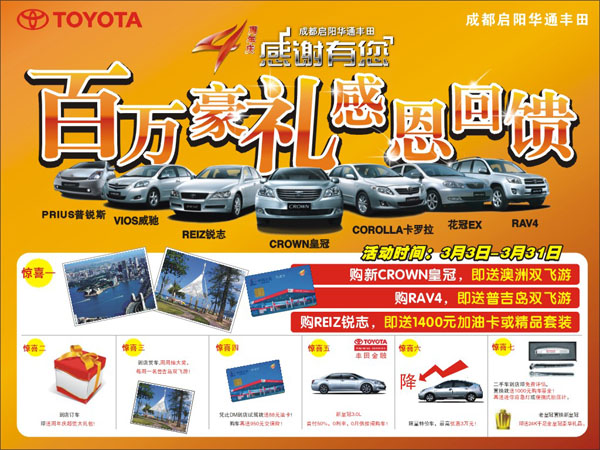 为了庆祝韦德网站官方入口华通丰田周围年,,,,,在3月3日至3月31日时代,,,,,凡到韦德网站官方入口华通丰田购置全新CROWN皇冠,,,,,就送价值万元澳洲双飞8日游;;;;;购RAV4,,,,,送泰国普吉岛双飞游。。。。。。。别的,,,,,到店订任一款车型,,,,,都将获赠超值豪华生日大礼包,,,,,内含950元交强险、多种原装精品等,,,,,以上礼物3月送完,,,,,以后不再赠予。。。。。。。